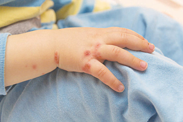 Giai đoạn bệnh phát triển mạnh nhất thể hiện rõ trên da của bé như chảy dãi nhiều, loét miệng, bỏ bú, phỏng nước ở niêm mạc lưỡi. Ngoài ra, xuất hiện bỏng nước ở các bàn tay chân, mông, đùi… Với các triệu chứng này khiến bé rất đau, khóc quấy mệt mỏi và biếng bú.