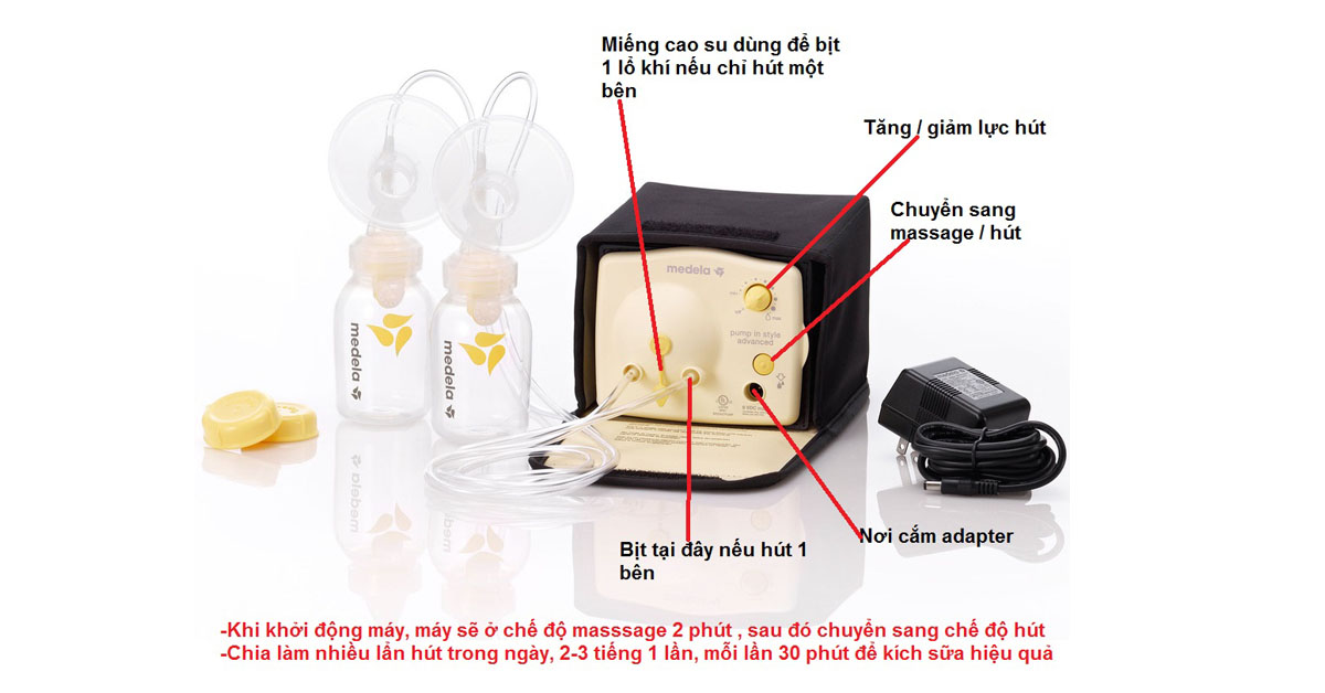 - Máy hút sữa Medela Pump, phụ kiện. Các mẹ nên cắm điện để kiểm tra máy trước khi dùng nhé!