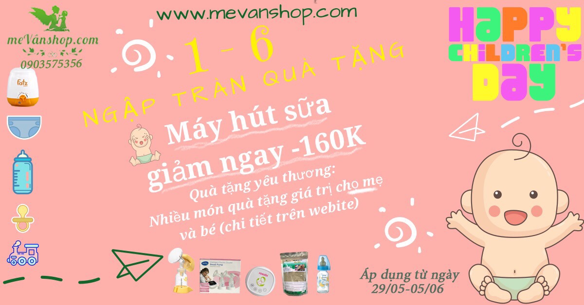 Chương trình khuyến mãi siêu khủng – Ngập tràn quà tặng cho mẹ và bé nhân ngày 1- 6 tại mevanshop.com. Chương trình ưu đãi đặc biệt giảm giá cực sốc duy nhất trong năm chúc mừng ngày của các bé. những thiên thần của bố mẹ. Khi mua các sản phẩm máy hút sữa, máy hâm sữa/tiệt trùng, thực phẩm lợi sữa, đồ sơ sinh,…Đến với Mẹ Vân Shop, bố mẹ sẽ nhận được gì?