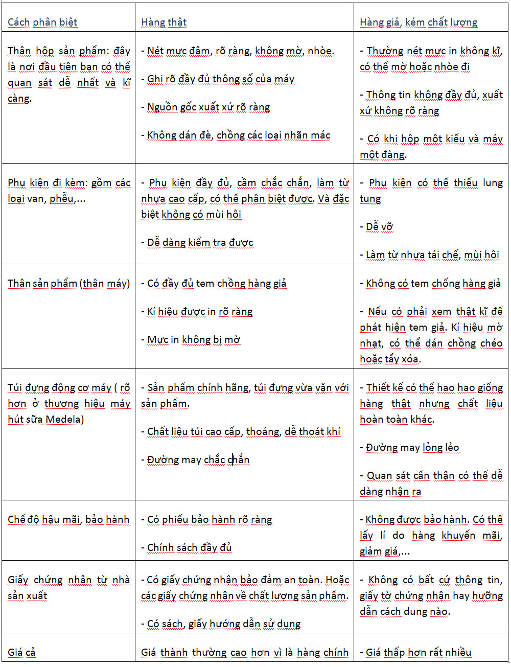 Những yếu tố ở bảng trên đây giúp mẹ có thể phân biệt được máy hút sữa thật – giả. Các mẹ bỉm sữa phải cẩn thận để không phải mua trúng những loại hàng trôi nổi nhé. Các mẹ nên tìm đến những cửa hàng, cơ sở kinh doanh uy tín, bảo đảm chất lượng để mua. Khi mua có chế độ hậu mãi sau bán rõ ràng, địa chỉ cụ thể. Không nên ham rẻ mà mua phải hàng giả nhé!