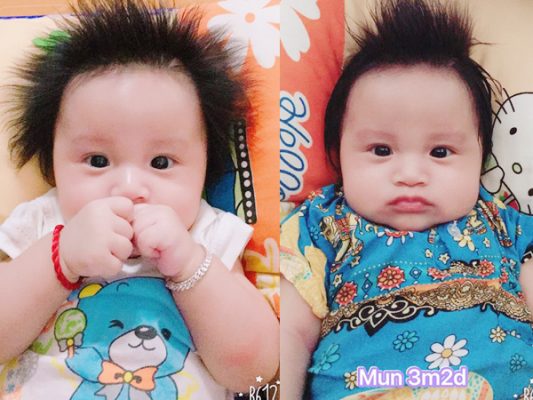Bé Mun sinh ngày 17-7-2017 bằng phương pháp sinh mổ. Bà mẹ này chia sẻ, lúc mới sinh, đầu bé vẫn dính nước ối nên tóc bết lại. Sau khi tắm gội sạch sẽ tóc dựng đứng cả lên. Càng lớn tóc càng dài và dựng thẳng hơn. Hiện tại bé Mun đã được 3 tháng 15 ngày mẹ chụp lại những bức ảnh siêu đáng yêu với mái tóc độc và lạ này. Từ khi bé Mun ra đời đến hiện tại chị Thảo chưa từng cắt tóc cho bé lần nào.